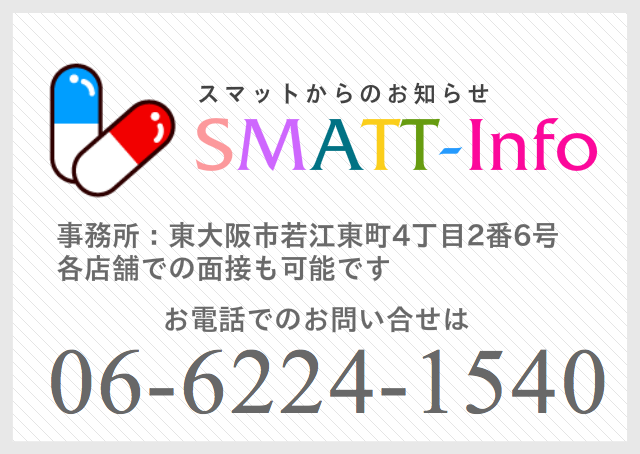 店舗紹介 調剤薬局と介護事業所を展開しており 在宅患者訪問サービスやジェネリック薬品も数多く取り扱っております。 スマット薬局 (大阪市東住吉区杭全) 若江スマット薬局 (東大阪市若江東町) 瓜破あさひ薬局 (大阪市平野区瓜破) 玉串スマット薬局 (東大阪市玉串元町) ハートさくら薬局 (東大阪市岩田町)