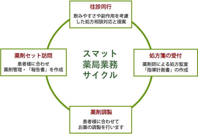 家族が在宅介護に参加することで、家族やチームの多職種の方々のお薬に関する負担を減らし、患者さんのQOL(生活の質)や治療効果を高める為の訪問薬剤管理及び指導も行っております。